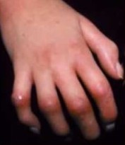 Las articulaciones pueden estar afectadas desde el comienzo de la enfermedad, en forma de rigidez y dolor articular, así como inflamación de las articulaciones (artritis). Esta afectación limita la movilidad de las articulaciones, sobre todo en los dedos de las manos, ya que aparecen contracturas que flexionan los dedos, como puede apreciarse en la foto.