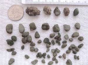 Los cálculos pigmentarios, como los de la imagen, se forman cuando la bilis contiene un exceso de bilirrubina. La bilirrubina es un pigmento biliar producido por la destrucción de los glóbulos rojos cuando estos envejecen. Aparecen en personas con enfermedades como cirrosis, infección de los conductos biliares (por el efecto de las bacterias sobre la bilirrubina) o enfermedades hemolíticas (por destrucción excesiva de glóbulos rojos). Suelen ser de color negro u ocre.