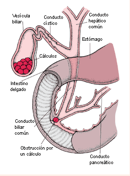 Los cálculos pueden atravesar las vías biliares y llegar al conducto pancreático, obstruyéndolo y dando lugar a una pancreatitis.